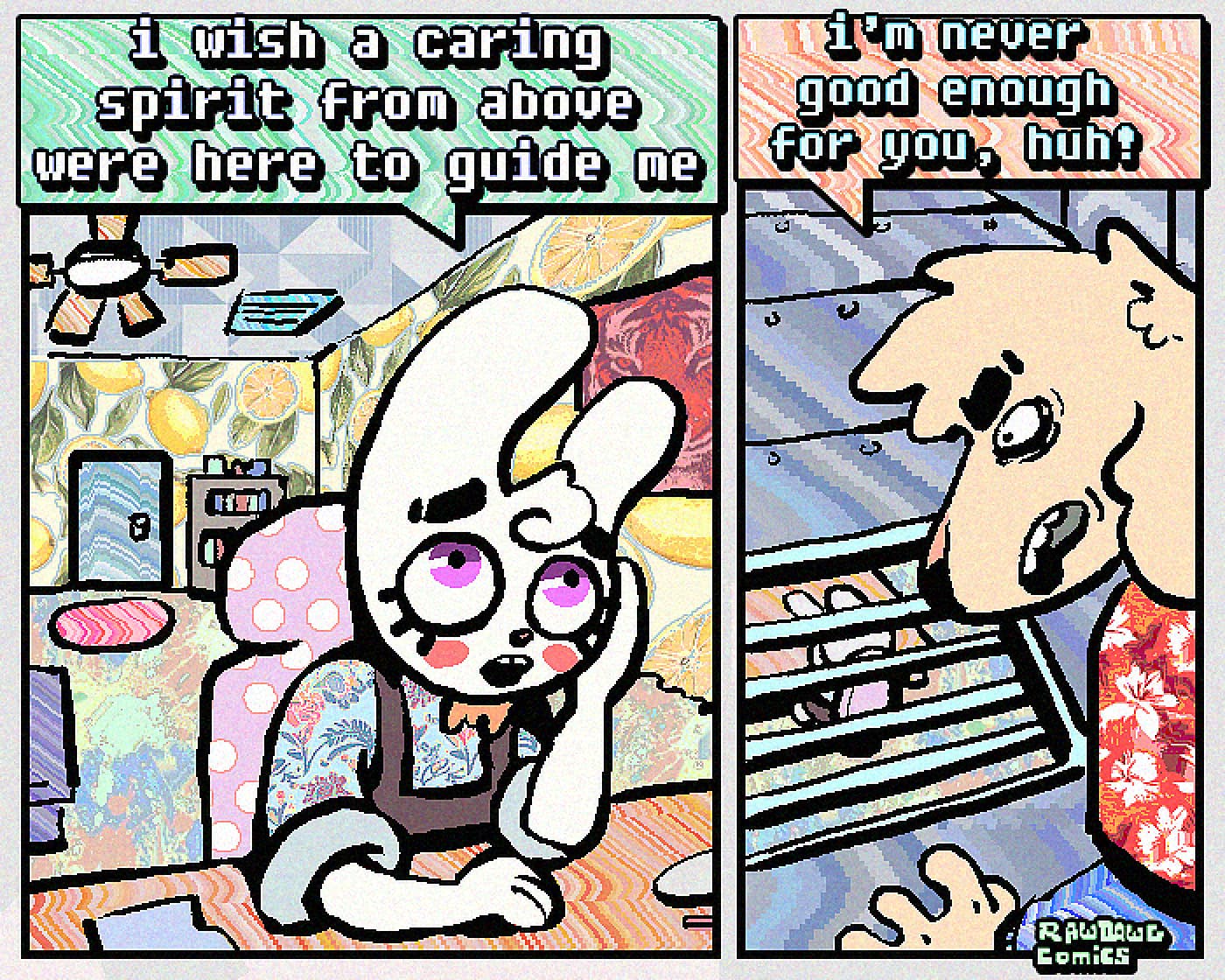 This artist puts out new comics near-daily, has a style that’s a combination of “classic brushwork, bitcrushed” and “hyper-fluorescent patterned digital inking”, and creates these comics that are just, like, abstract and weird little vignettes.